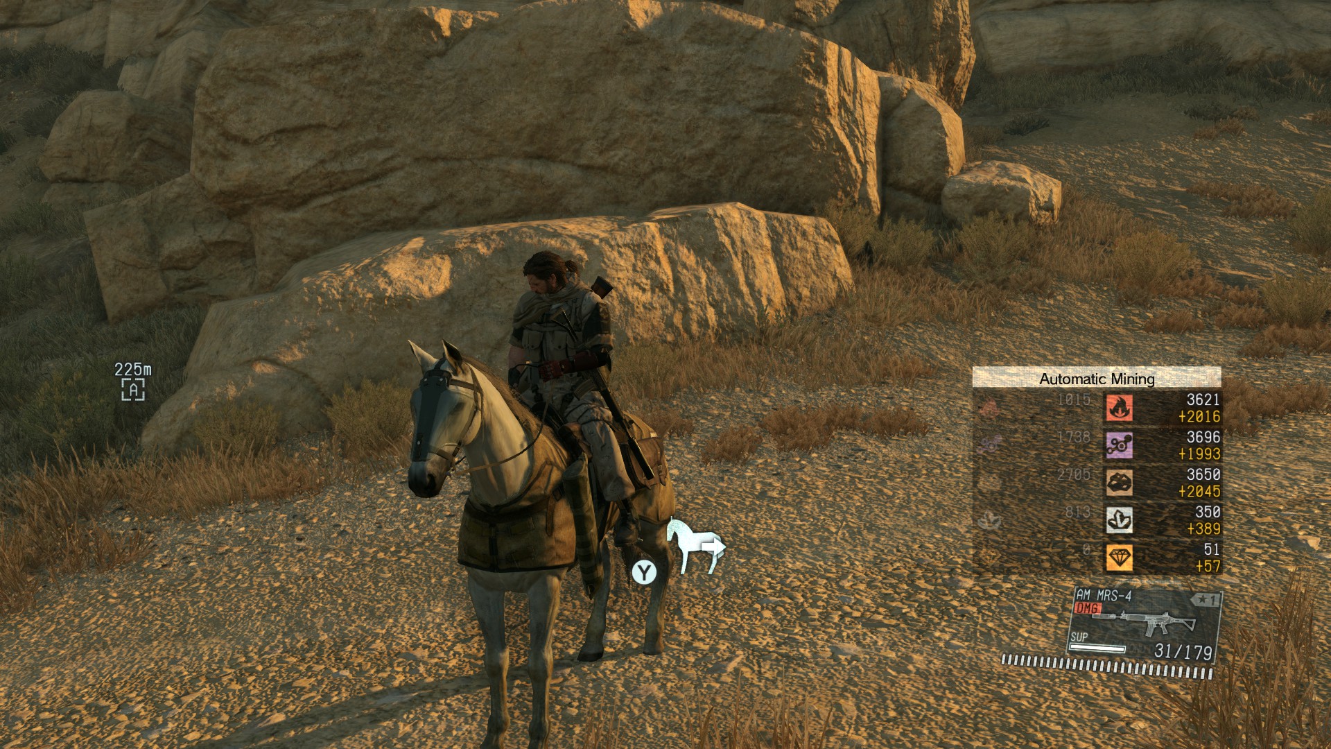 The game offers a rich and satisfying customization system for your loadout. Almost anything you bring with you can be customized to a certain degree - even the camouflage I took on missions with me I would preselect in order to best match the area I was in (and since camouflage effectiveness is an explicit game mechanic in previous MGS games, I’m pretty sure it still matters in TPP.) You have a set of “buddies” you can bring into missions with you, the first of which is the D-Horse. I thought a horse would only hinder me in a stealth game, but surprisingly I grew to like the horse a lot and developed a lot of gear for it.